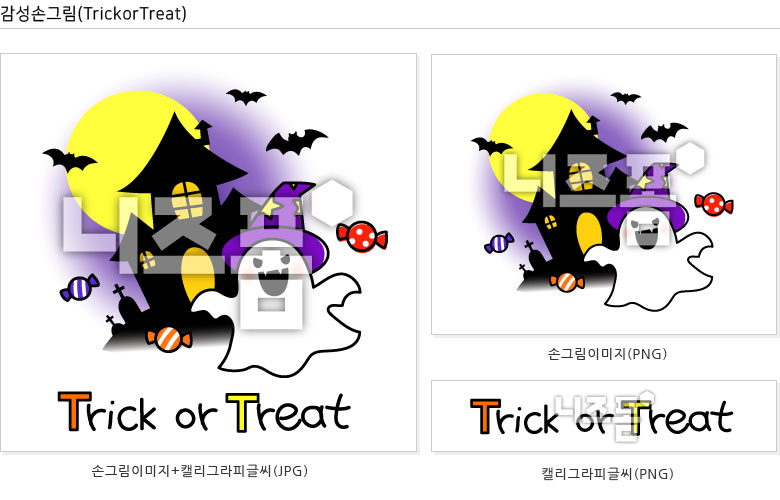 일러스트와 캘리그라피글씨로 구성된 감성손그림 클립아트(TrickorTreat)입니다.