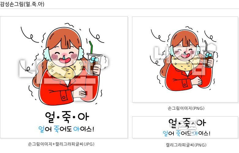 일러스트와 캘리그라피글씨로 구성된 감성손그림 클립아트(얼.죽.아)입니다.