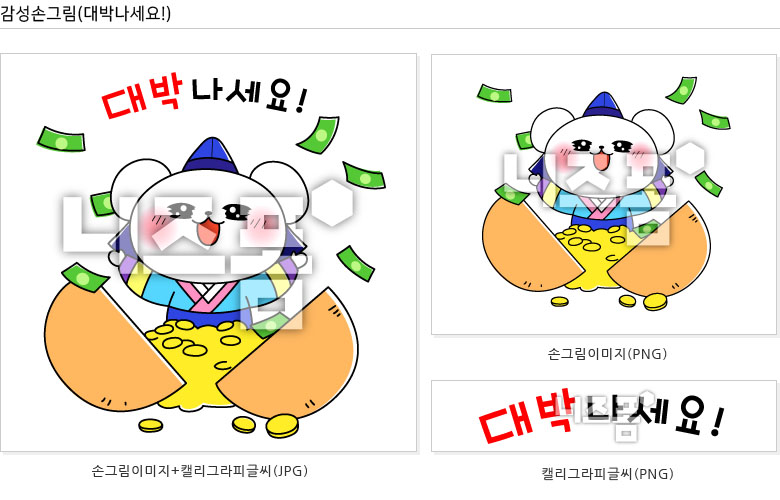 일러스트와 캘리그라피글씨로 구성된 감성손그림 클립아트(대박나세요!)입니다.