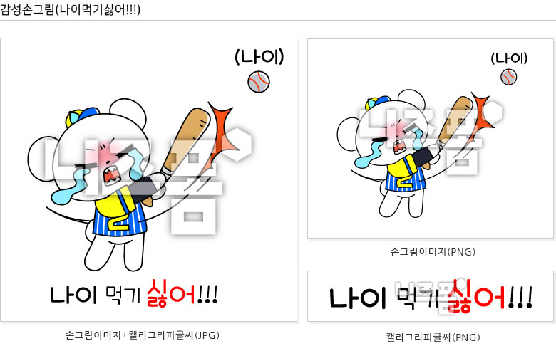 일러스트와 캘리그라피글씨로 구성된 감성손그림 클립아트(나이먹기싫어!!!)입니다.