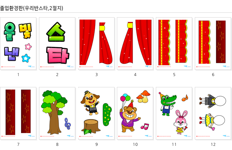 ★ 샘플+설명 프린트 를 클릭하시면, 샘플 1장이 프린트됩니다 구매 전, 샘플프린트를 통해 상품의 상세 이미지를 확인해 주세요! 본 콘텐츠는 표준보육과정에 맞춘 2월 졸업 주제환경판으로, 아이들이 꼭 알아야 할 어린이집, 유치원 필수 주제별 환경판 중 하나입니다. 우리반 스타인 아이들과 POP로 구성되었으며, 프린트(A4)되는 장수는 총 12장입니다. 환경판의 크기는 완성시 약 800mm x 600mm(A4용지 8배)입니다. 턱시도와 드레스를 입은 사람 부분에 아이들의 얼굴 사진을 알맞게 오려 붙여서 사용하시면 됩니다. 매월 주제에 맞게 주제별 환경판으로 유치원, 어린이집을 예쁘게 꾸며 보세요^^ | ![]() |
