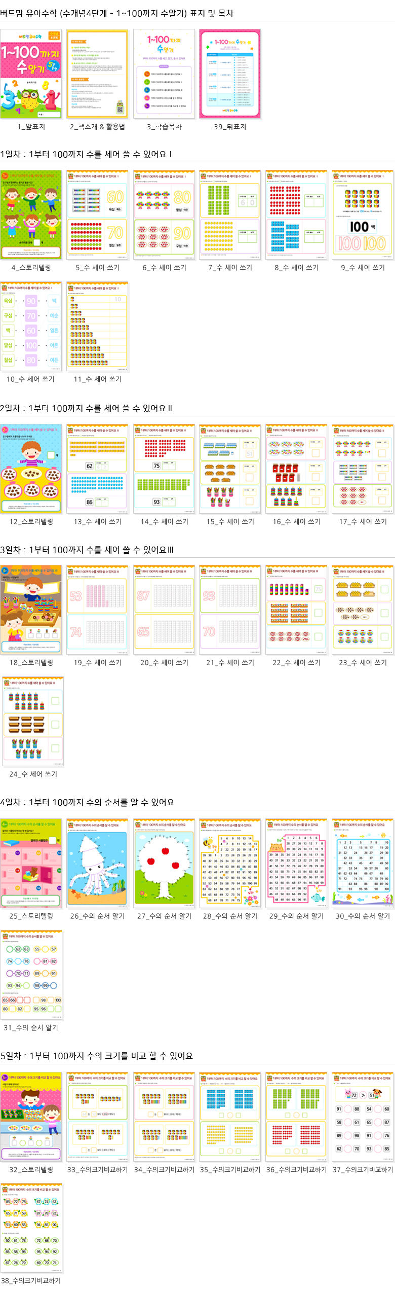 버드맘 유아수학의 노하우가 담긴 체계적인 학습내용으로 총 5일차의 학습내용이 수록되어 있으며, 매일 20분씩 5일 동안 1일차씩 학습하며