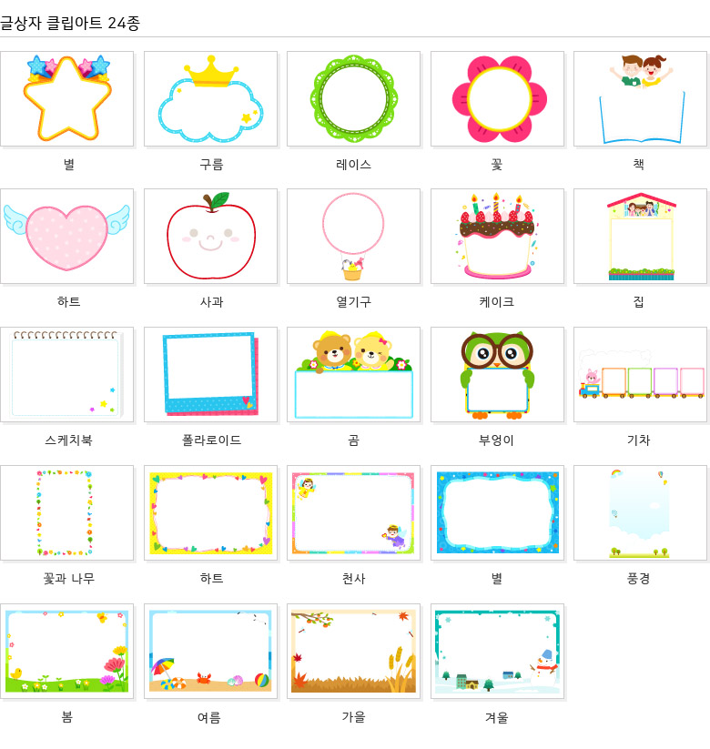 본 클립아트는 유치원.어린이집의 행사 및 환경판에 사용하기 좋은 일러스트로 구성된 클립아트이며, 총 24컷으로 구성되어 있습니다.