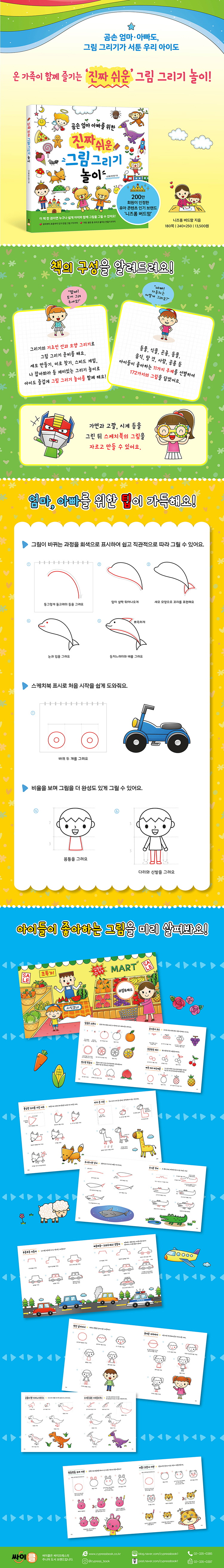 그러나 이것저것 그려 달라고 조르는 아이가 원하는 그림을 그려주지 못해 곰손 엄마, 아빠들은 당황하기 일쑤입니다. 이제부터는 곰손 엄마, 아빠도 『진짜 쉬운 그림 그리기 놀이』로 아이와 함께 즐겁게 그림 그리기 놀이를 시작할 수 있습니다.