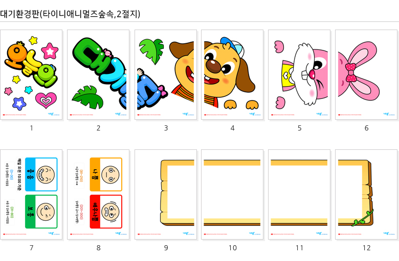 | 본 콘텐츠는 어린이집, 유치원 환경 구성에 활용 가능한 대기환경판 도안으로 프린트하고 오리고 붙여서 누구나 쉽게 완성할 수 있습니다. 캐릭터 이미지와 타이틀POP, 대기환경판 도안, 기타 이미지 아이콘으로 구성되어있으며, 프린트(A4)되는 장수는 총 12장입니다. 완성 시 환경판의 크기는 약 770mm x 540mm로 2절지에 최적화되어 있습니다.(A4용지 약 8배) 귀여운 타이니애니멀즈숲속 대기환경판으로 유치원, 어린이집을 예쁘게 꾸며 보세요^^ | ![]() |