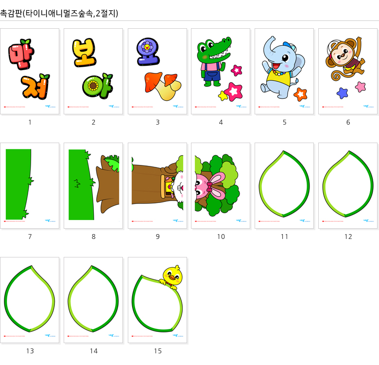 | 본 콘텐츠는 어린이집, 유치원 환경 구성에 활용 가능한 촉감판 도안으로 프린트하고 오리고 붙여서 누구나 쉽게 완성할 수 있습니다. 캐릭터 이미지와 타이틀POP, 글상자 도안, 기타 이미지 아이콘으로 구성되어있으며, 프린트(A4)되는 장수는 총 15장입니다. 완성 시 환경판의 크기는 약 540mm x 770mm로 2절지에 최적화되어 있습니다.(A4용지 약 8배) 귀여운 타이니애니멀즈숲속 촉감판으로 유치원, 어린이집을 예쁘게 꾸며 보세요^^ | ![]() |
